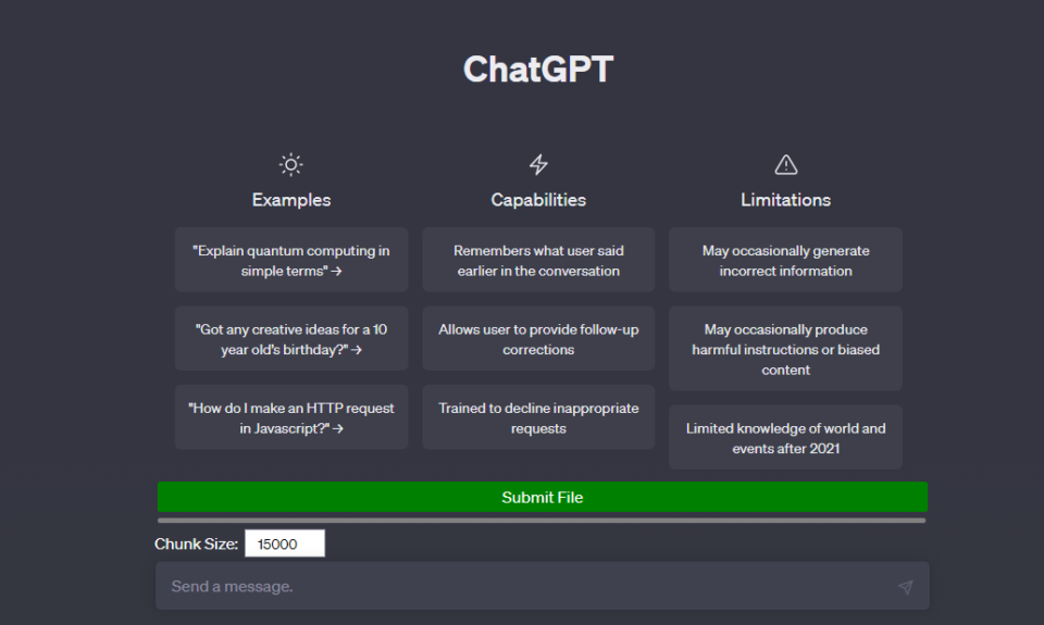 3. Mendukung pengunggahan file berukuran besar: File Uploader ini membagi file yang diunggah menjadi potongan-potongan kecil (chunks) dan mengirimkannya ke Chat GPT secara bertahap. Hal ini memungkinkan pengguna untuk mengunggah file dengan ukuran besar tanpa membebani sumber daya secara berlebihan atau mengalami pembatasan ukuran file yang terlalu kecil.